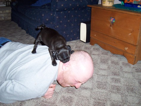 Mr. Puggles was not one to be bothered with niceties such as going to the bathroom outside. He started by jumping from the bed at night and going into the closet to relieve himself on the carpeting. Frequent trips outside were the only solution. Over the years, the carpeting in most rooms was replaced with hardwood flooring. Much easier to clean! We had to keep him away from the bottom of the Christmas tree, since he would drink the water and then have to pee more. I recall one time outside when I was talking to my daughters and Mr. Puggles was standing nearby. A minute later I looked down and he was peeing on my shoes and pant leg. At least he didn’t tell me it was raining.