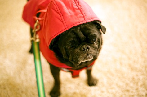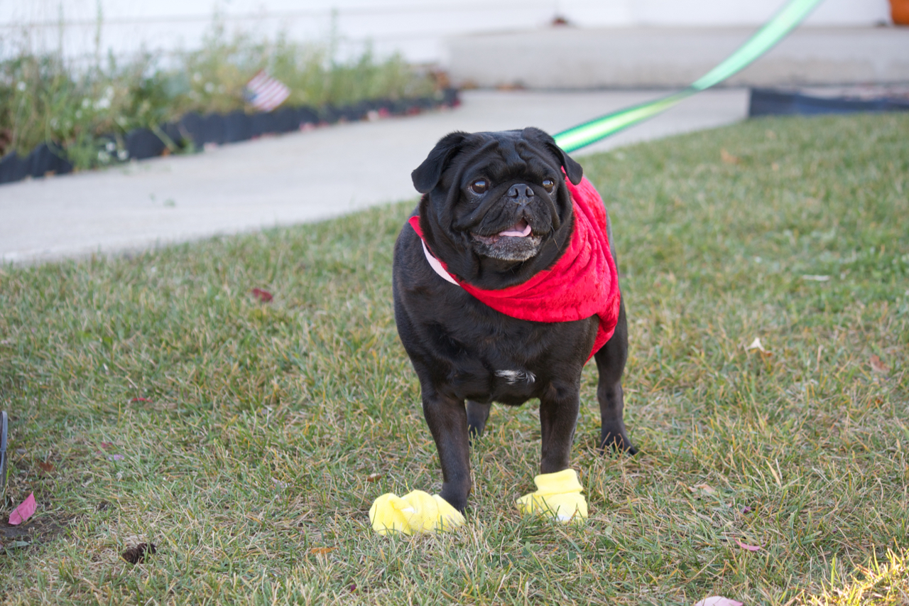 Even as Mr. Puggles’ rear legs began to fail, we still found ways to enjoy the outdoors. I bought a hip harness from a web store that caters to disabled pets. It gave his Pug caboose just enough help to still be able to roam about the yard, marking every tree and barking at falling acorns and the occasional brave squirrel. I felt slight pangs of dread as his face turned from jet black to salt and pepper. I would not want to face losing him, so I pushed those thoughts aside.