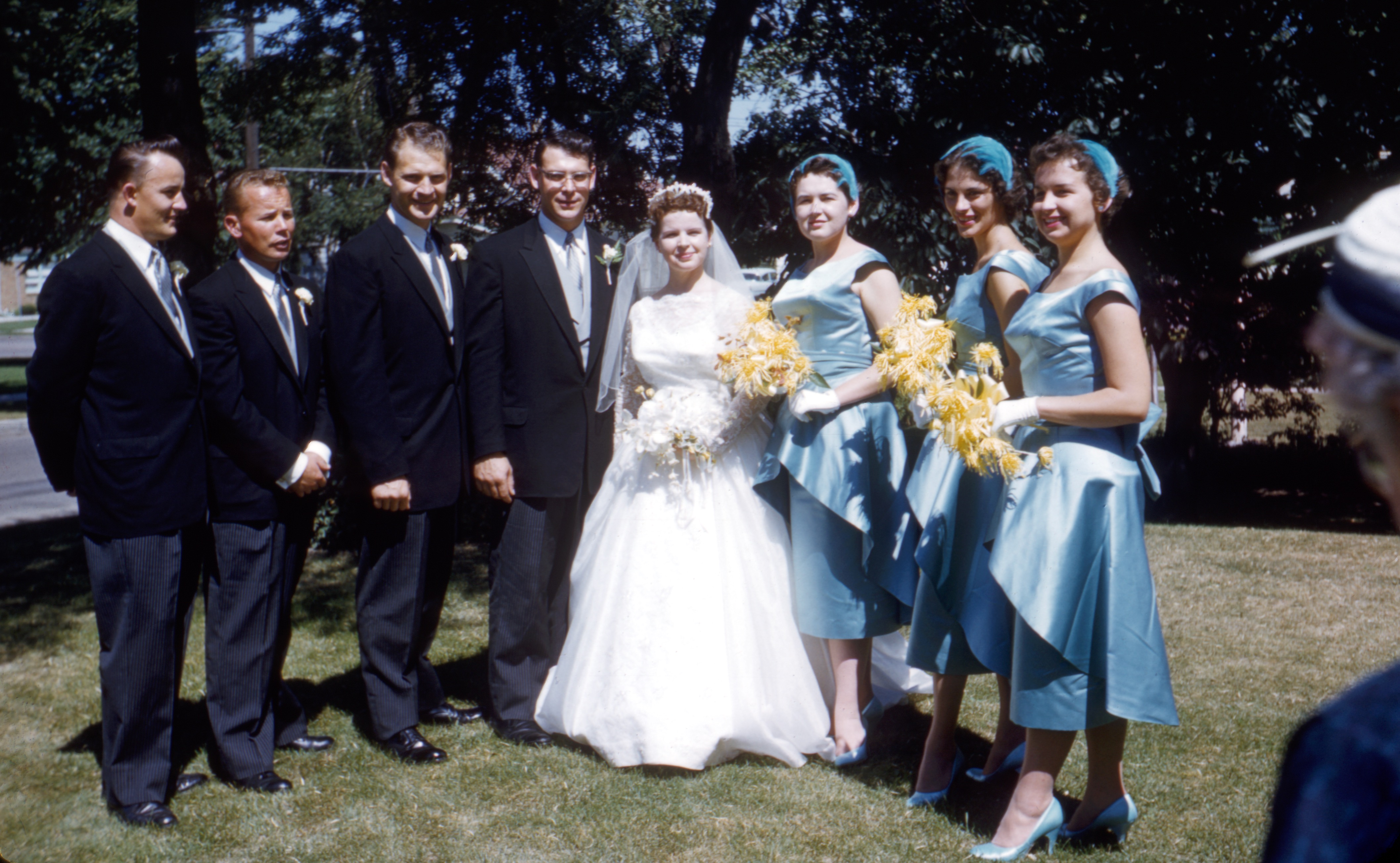 The wedding party, left to right: Jack Richards, Tinker Mulqueen, Donn Hanneman, David Hanneman, Mary Hanneman, Joan Mulqueen, Lavonne Hanneman, Ruth Mulqueen.