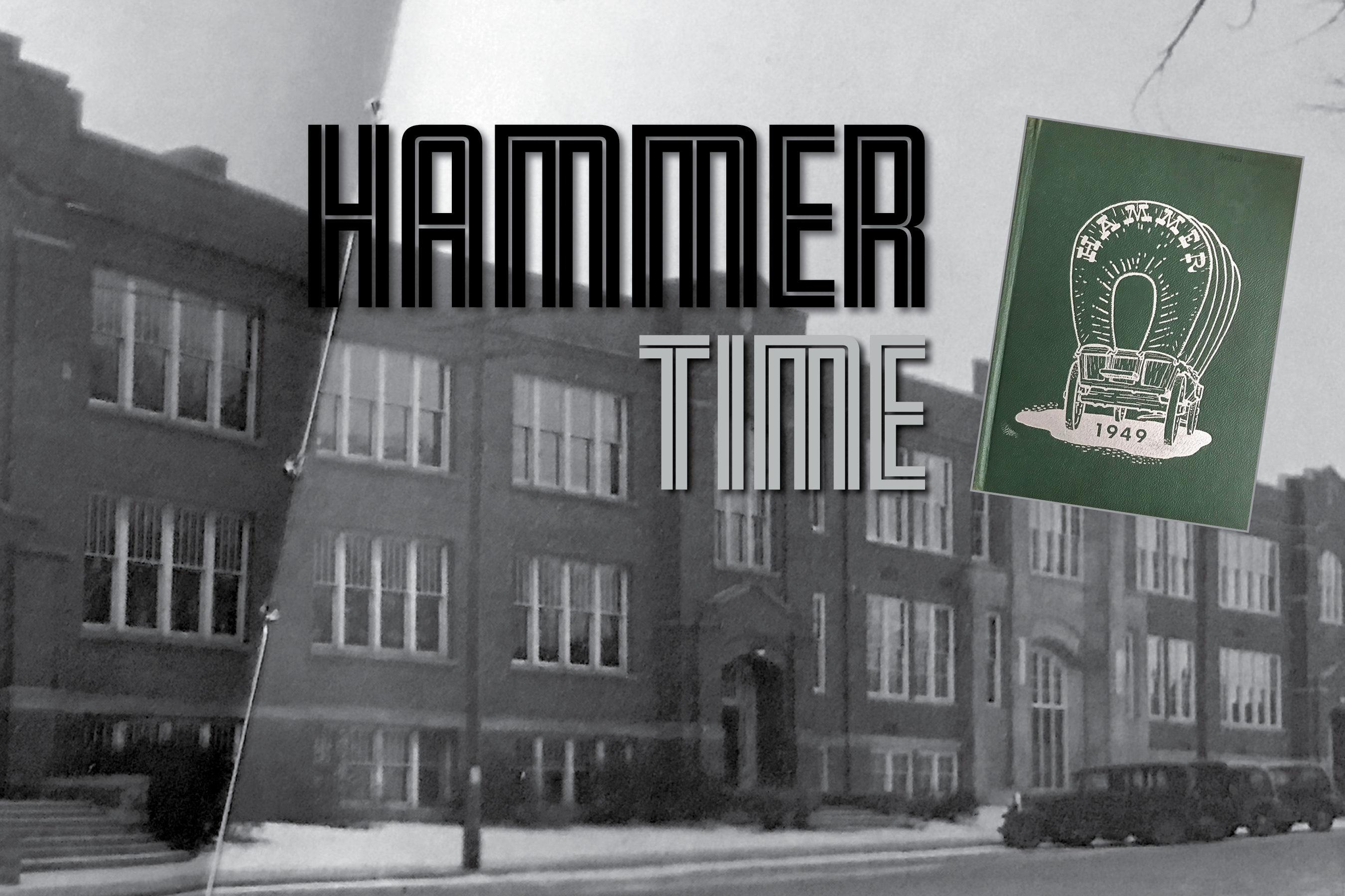 Top Photo: Mauston High School as it appeared in the center spread of the 1949 yearbook. The yearbook cover design is shown upper right.