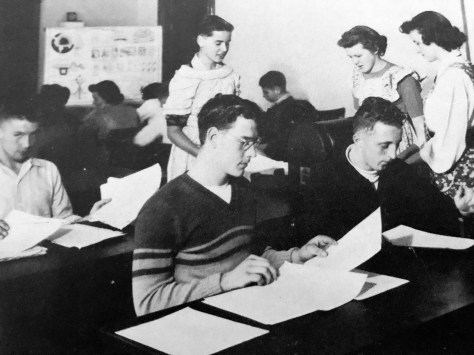The biggest surprise came on the page featuring the student newspaper, The Blue Quill. Dad is listed as one of two staff artists. I had viewed this yearbook before, but never noticed this. We have no issues of the The Blue Quill, so we don’t know what he and co-artist Donald Krueger sketched for the news, feature and sports pages. I’ve seen a few simple sketches and doodles he drew on the yearbook autograph pages, but nothing else. Art talent ran in the family, we covered elsewhere regarding Grandpa Carl F. Hanneman and his drawings for the Wisconsin Rapids Lincoln High School Ahdawagam.