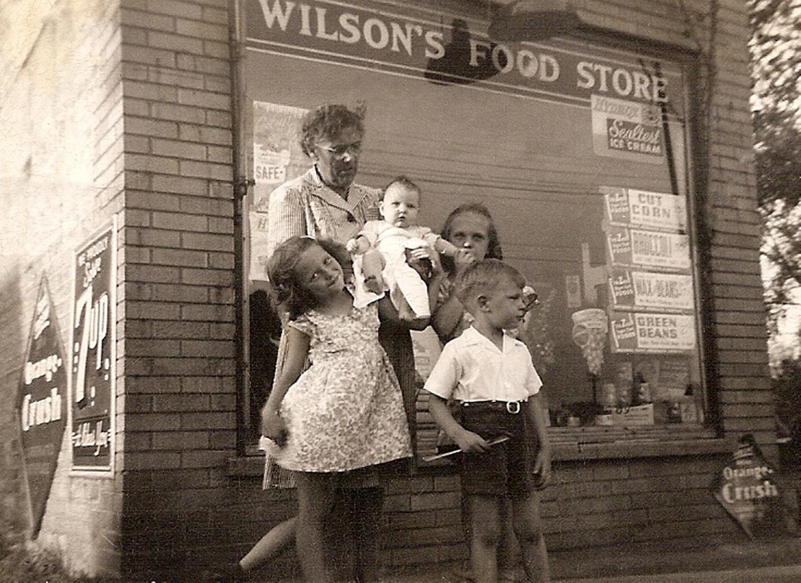 The Wilson family, including children Steve and Laurni Lee, operated the grocery in the late 1940s and early 1950s. The family living quarters were behind the store. Any time someone entered, a bell rang in the back and family members took turns waiting on customers. Shown on the right side of the photo are Laurni Lee (Wilson) Breedlove and Steve Wilson. Emma (Treutel) Carlin (1877-1962) is holding baby Bonnie (Treutel) Young. In front of them is Bonnie’s older sister, Patricia (Treutel) Anderson. Emma was Nina and Ruby’s aunt from Arpin, Wisconsin. Bonnie and Patricia are Laurni Lee and Steve’s cousins.