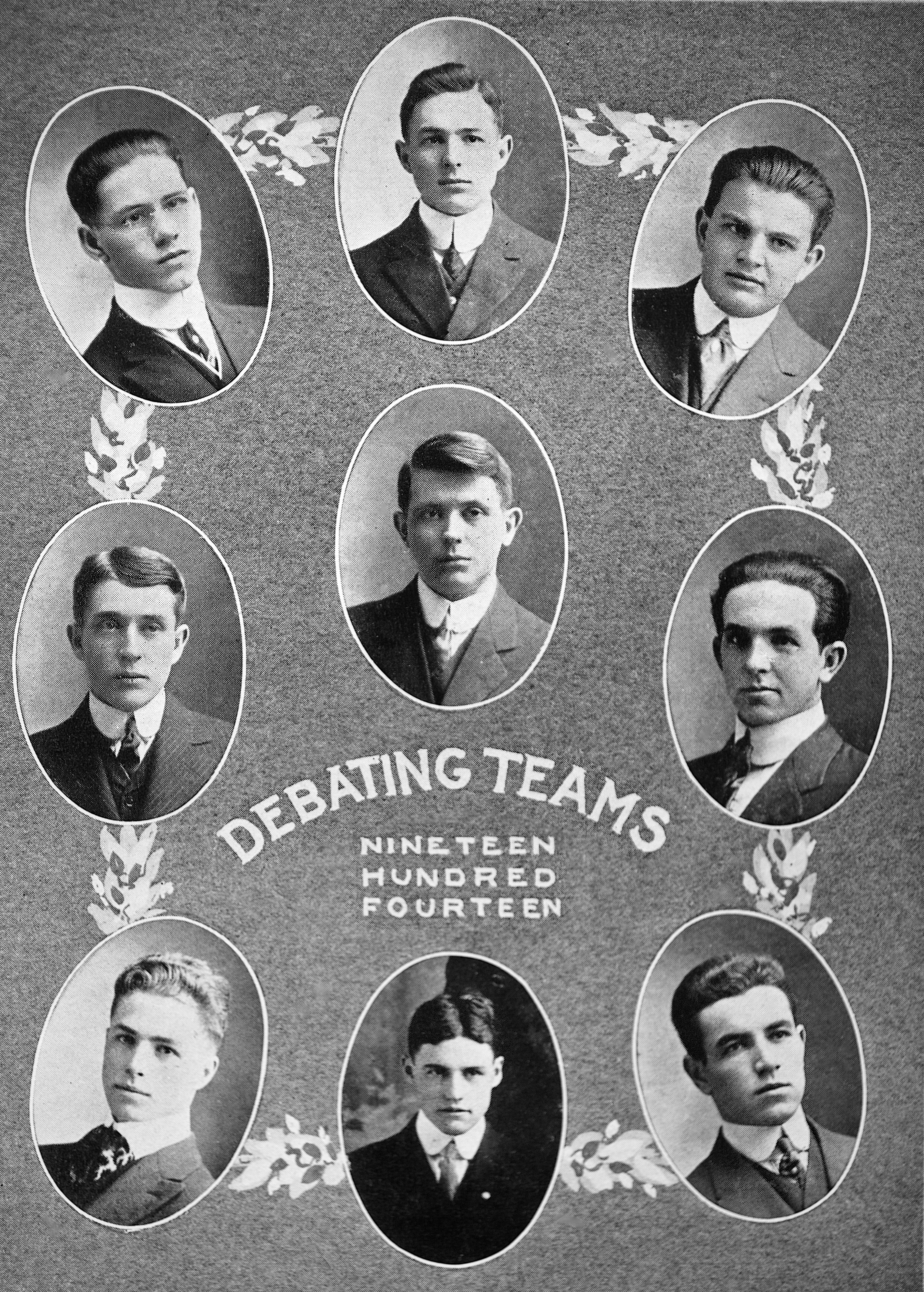 The young men pictured in the image, the yearbook stated, were among the very best the school had developed. Participants in forensics tended to also be those involved in other worthy extracurricular pursuits, such as athletics, music and culture. “This is what every well-organized high school should stand for,” the yearbook read, “and we are proud of the boys who represented us in debate.” Indeed, several of them went on to serve their country as soldiers in World War I. The debate team lineup: