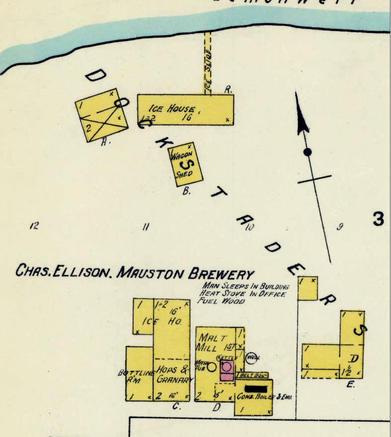 A plat map shows the location of the Mauston Brewery in relation to homes on Morris and Winsor Streets.