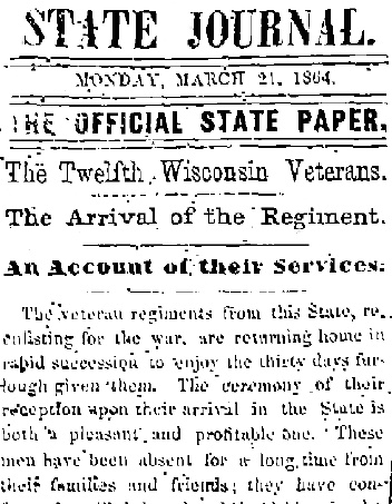 The Wisconsin State Journal covered the return of the 12th Infantry Regiment on March 21, 1864.